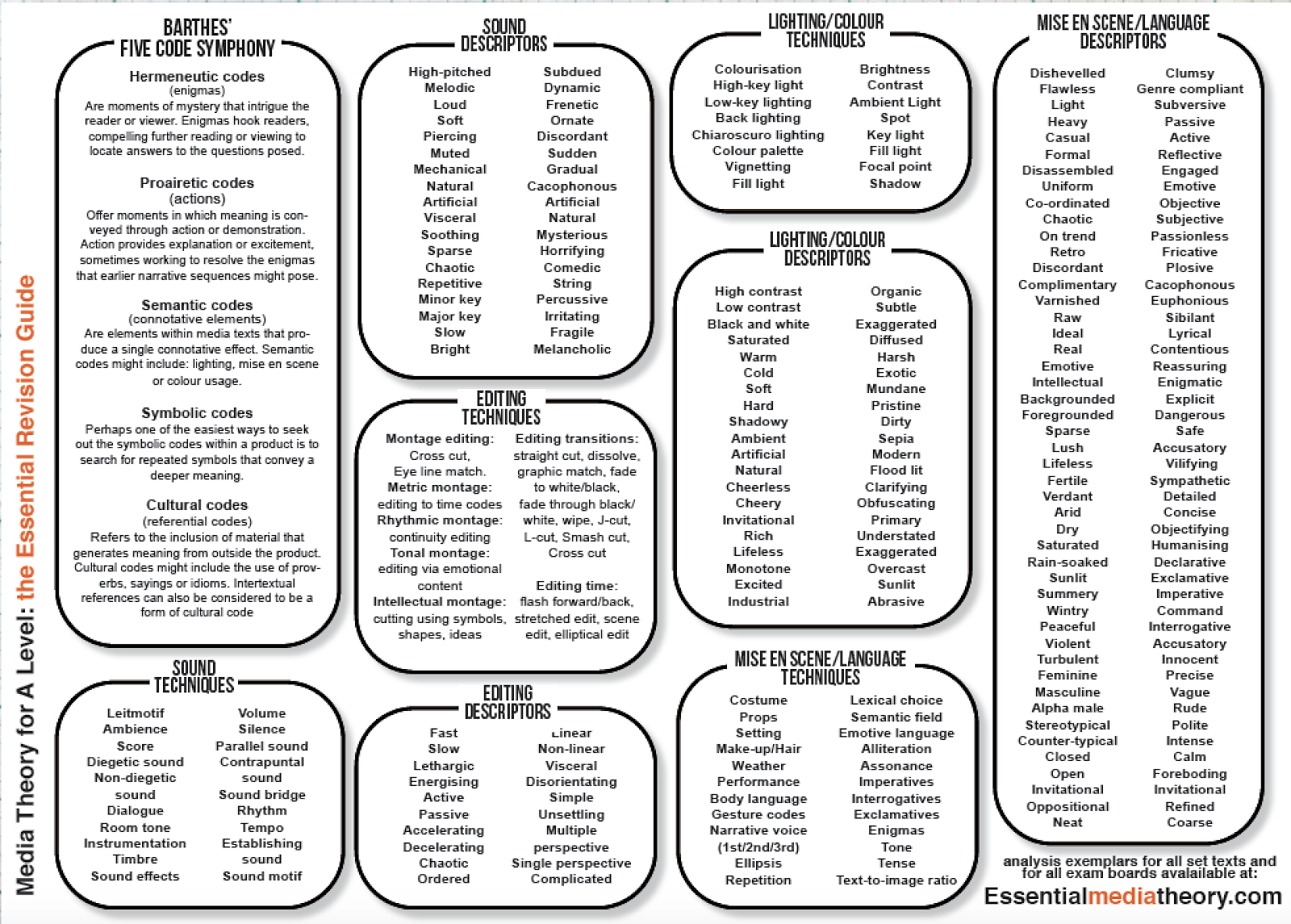 Candidates must analyse the text to establish how meaning is created. Therefore, candidates must be aware of how the technical aspects of media language, and the conventions of the moving image medium, are used to create meaning, both explicitly and implicitly. Candidates must be able to analyse an unseen media text, using technical terms, to explain how specific meaning, including representations of individuals/groups/events/places, has been created. Candidates must be familiar with the technical elements in the subject content.
